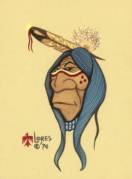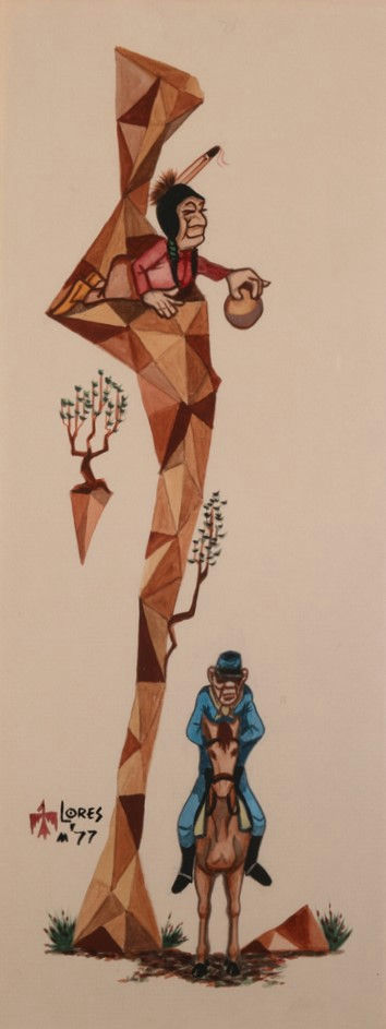 William Vann Flores began drawing at a young age with caricatures of the local high school football team, signing his artwork as “Will-Yum.” Born in Wisconsin and raised in Anadarko, Oklahoma, William was the only child of Jessie Vann, a member of the Cherokee Nation. He quickly decided he wanted to pursue art, doing illustration work and joining the print club at Chilocco Indian School in Newkirk, Oklahoma. After graduation, he began a career as a printer for the Anadarko Daily News, where he was better known as Bill Flores.